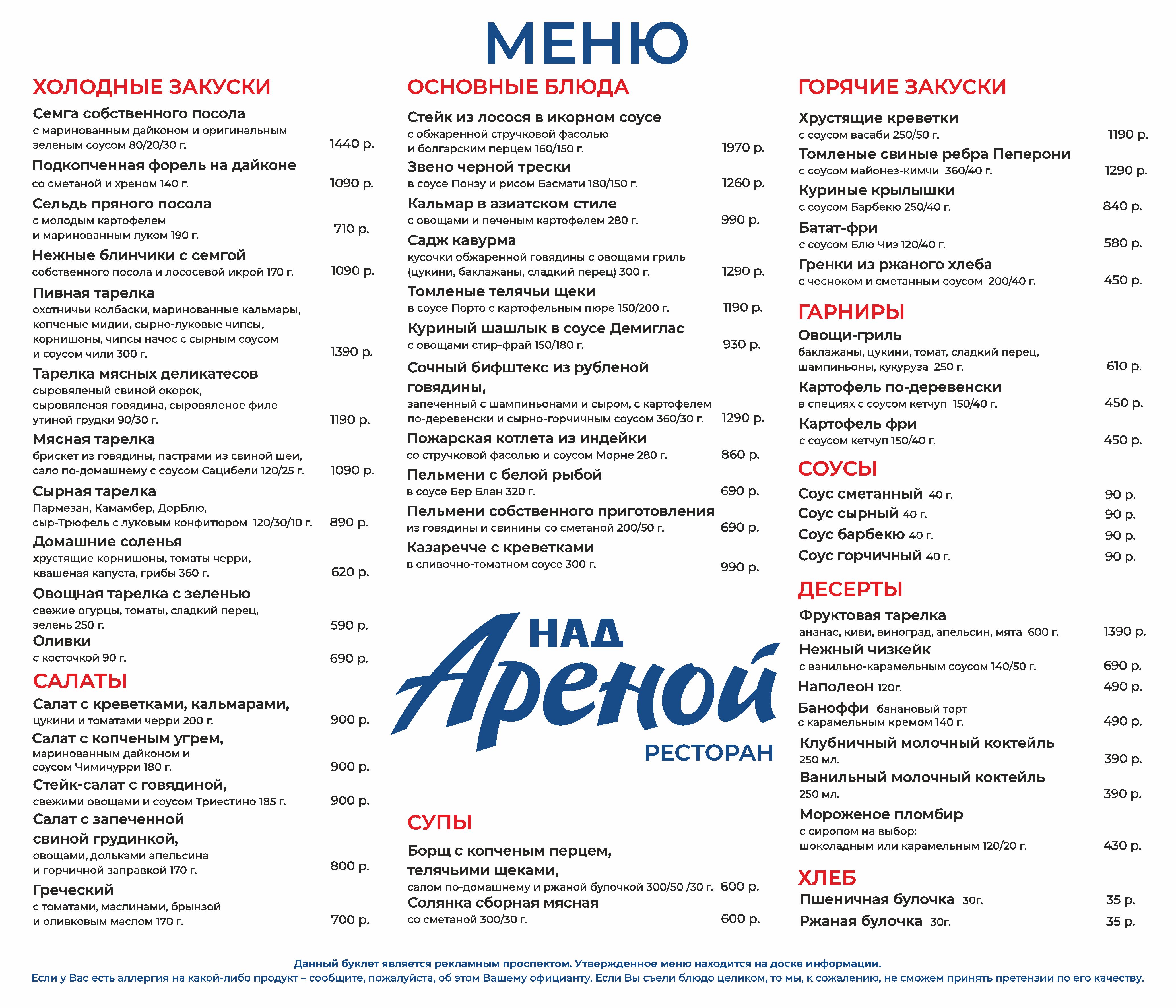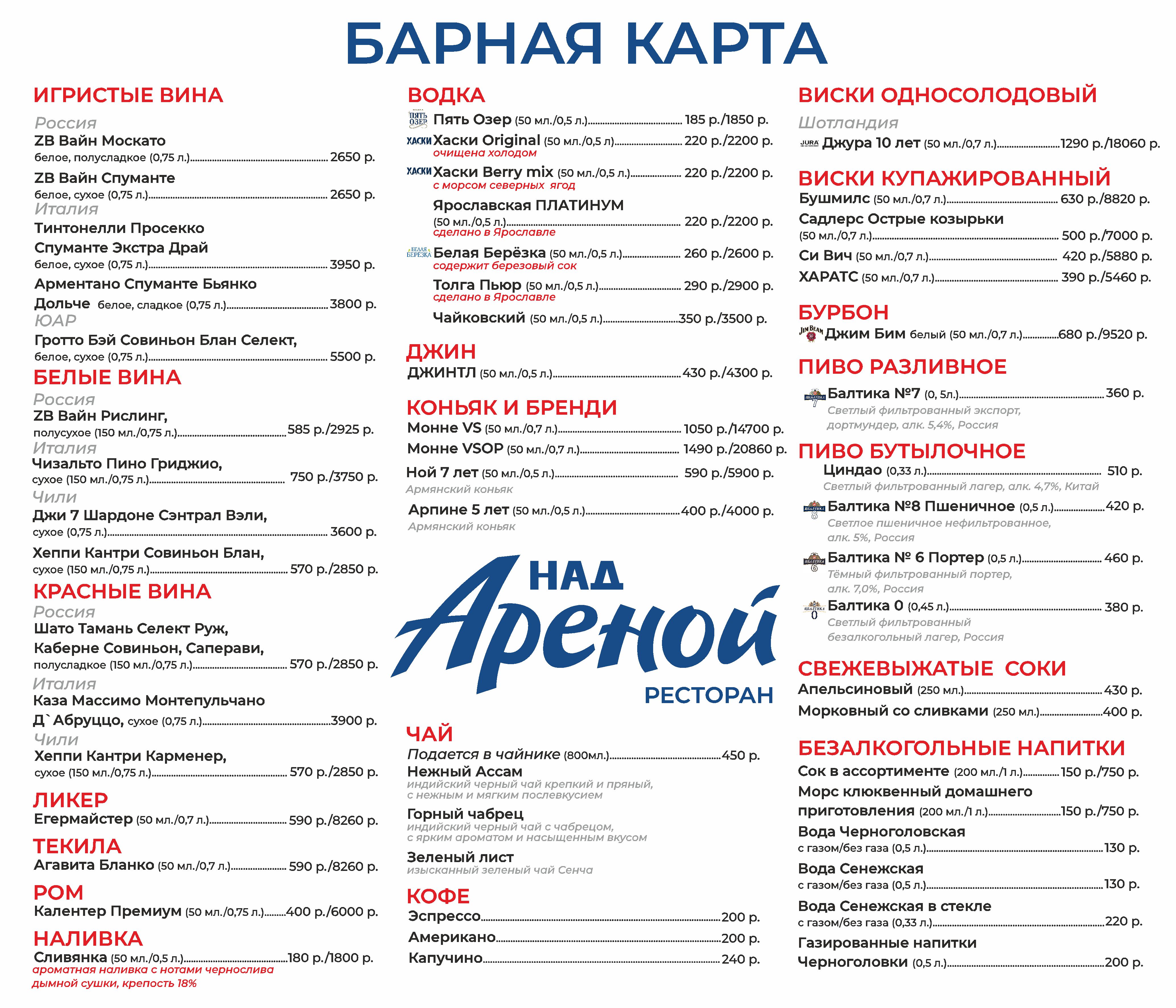 Ресторан «Над Ареной», расположенный на 3-м этаже УКРК «Арена-2000. Локомотив» работает по предварительному заказу и в дни проведения спортивно-массовых мероприятий в УКРК.